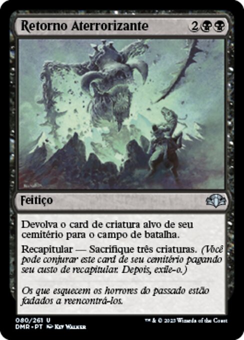 ![]() Variations : 1Parts— | Retorno AterrorizanteDevolva o card de criatura alvo de seu cemitério para o campo de batalha. Recapitular — Sacrifique três criaturas. (Você pode conjurar este card de seu cemitério pagando seu custo de recapitular. Depois, exile-o.)