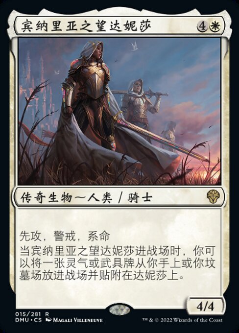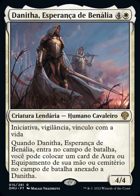 |  Variations : 2Parts— | Danitha, Benalia's Hope4 / 4 First strike, vigilance, lifelink When Danitha enters, you may put an Aura or Equipment card from your hand or graveyard onto the battlefield attached to Danitha.