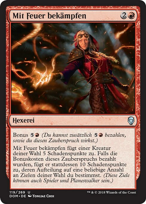 ![]() Variations— Parts— | Fight with FireKicker Fight with Fire deals 5 damage to target creature. If this spell was kicked, it deals 10 damage divided as you choose among any number of targets instead. (Those targets can include players and planeswalkers.)