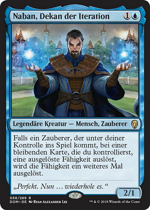 ![]() Variations— Parts— | Naban, Dean of Iteration2 / 1 If a Wizard you control entering causes a triggered ability of a permanent you control to trigger, that ability triggers an additional time.