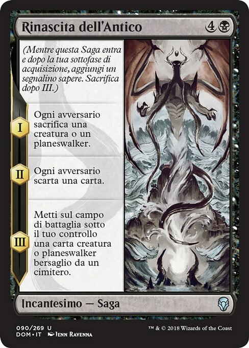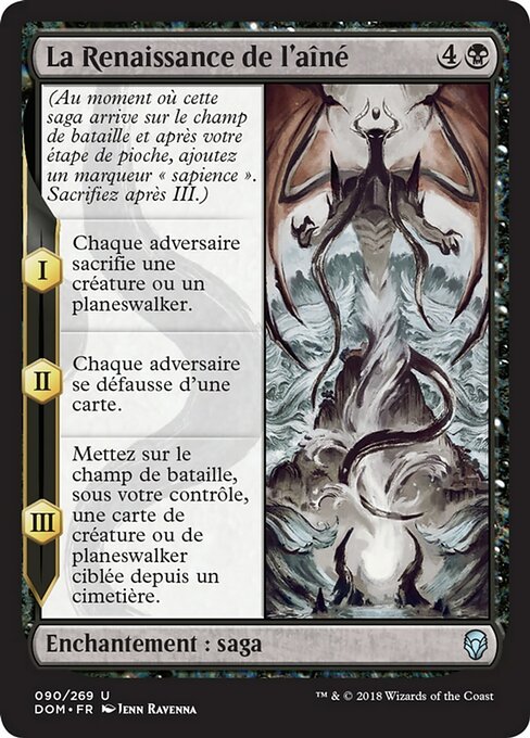 ![]() Variations— Parts— | The Eldest Reborn(As this Saga enters and after your draw step, add a lore counter. Sacrifice after III.) I — Each opponent sacrifices a creature or planeswalker of their choice. II — Each opponent discards a card. III — Put target creature or planeswalker card from a graveyard onto the battlefield under your control.