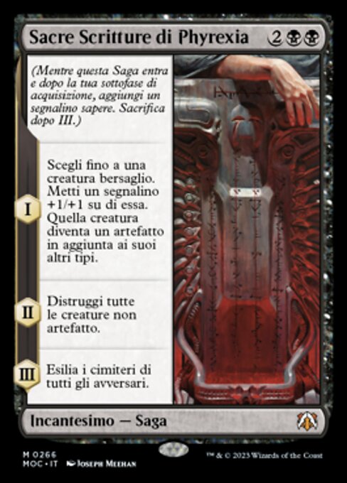 ![]() Variations— Parts— | Sacre Scritture di Phyrexia(Mentre questa Saga entra e dopo la tua sottofase di acquisizione, aggiungi un segnalino sapere. Sacrifica dopo III.) I — Scegli fino a una creatura bersaglio. Metti un segnalino +1/+1 su di essa. Quella creatura diventa un artefatto in aggiunta ai suoi altri tipi. II — Distruggi tutte le creature non artefatto. III — Esilia tutte le carte dai cimiteri di tutti gli avversari.
