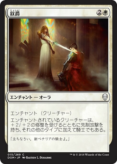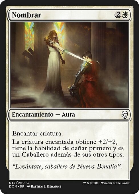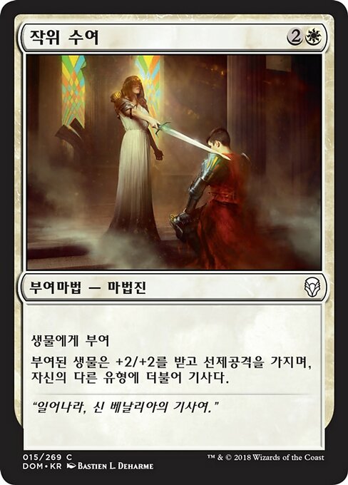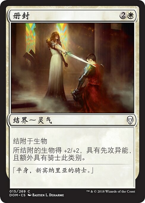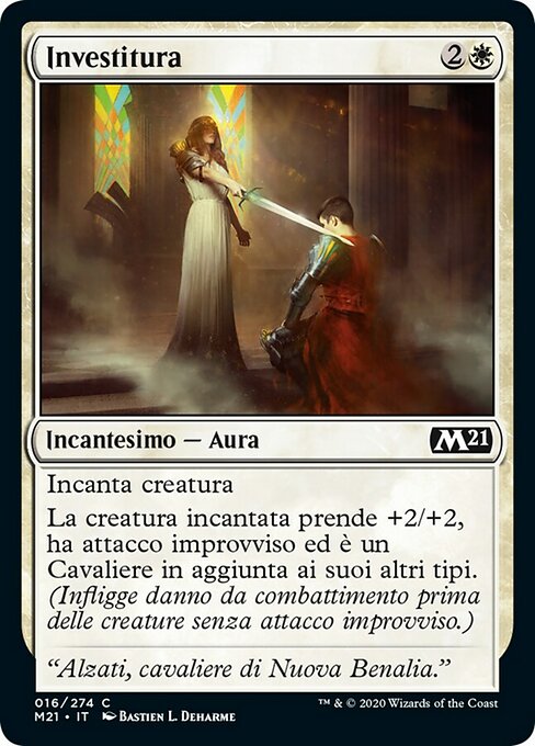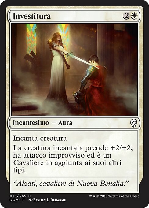 ![]() Variations— Parts— | InvestituraIncanta creatura La creatura incantata prende +2/+2, ha attacco improvviso ed è un Cavaliere in aggiunta ai suoi altri tipi.