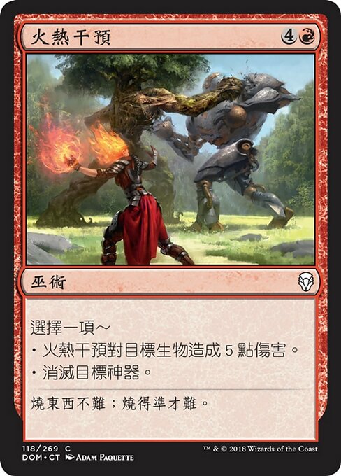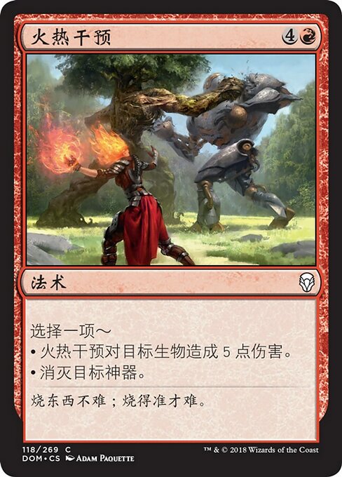 |  Variations— Parts— | 焦熱の介入以下から1つを選ぶ。 • クリーチャー1体を対象とする。焦熱の介入はそれに5点のダメージを与える。 • アーティファクト1つを対象とし、それを破壊する。