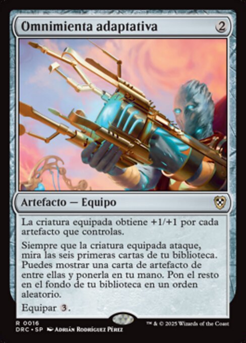 |  Variations : 1Parts— | Adaptive OmnitoolEquipped creature gets +1/+1 for each artifact you control. Whenever equipped creature attacks, look at the top six cards of your library. You may reveal an artifact card from among them and put it into your hand. Put the rest on the bottom of your library in a random order. Equip