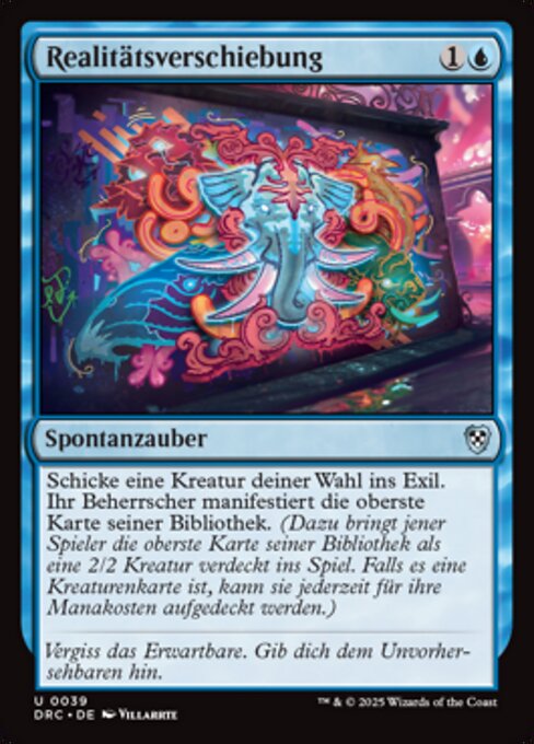 |  Variations— Parts— | Mutamento della RealtàEsilia una creatura bersaglio. Il suo controllore manifesta la prima carta del suo grimorio. (Quel giocatore mette la prima carta del suo grimorio sul campo di battaglia a faccia in giù come una creatura 2/2. Se è una carta creatura, può essere girata a faccia in su in qualsiasi momento pagando il suo costo di mana.)