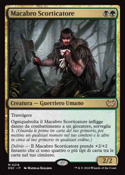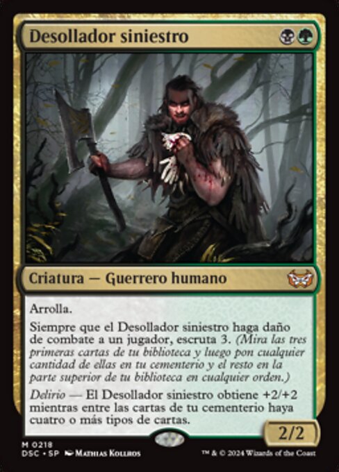 ![]() Variations— Parts— | Grim Flayer2 / 2 Trample Whenever this creature deals combat damage to a player, surveil 3. (Look at the top three cards of your library, then put any number of them into your graveyard and the rest on top of your library in any order.) Delirium — This creature gets +2/+2 as long as there are four or more card types among cards in your graveyard.