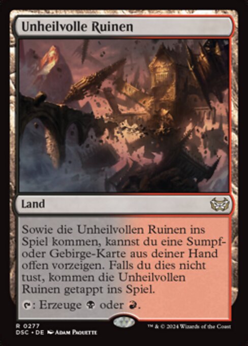 ![]() Variations— Parts— | Foreboding RuinsAs this land enters, you may reveal a Swamp or Mountain card from your hand. If you don't, this land enters tapped.