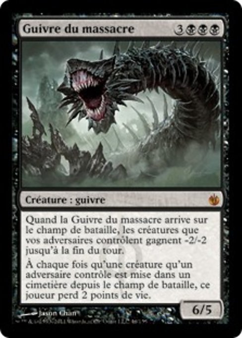 ![]() Variations— Parts— | Guivre du massacre6 / 5 Quand la Guivre du massacre arrive, les créatures que vos adversaires contrôlent gagnent -2/-2 jusqu'à la fin du tour. À chaque fois qu'une créature qu'un adversaire contrôle meurt, ce joueur perd 2 points de vie.