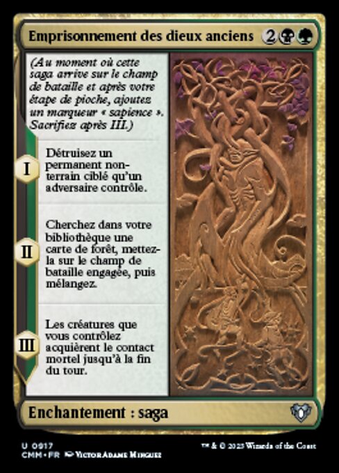 ![]() Variations— Parts— | Emprisonnement des dieux anciens(Au moment où cette saga arrive et après votre étape de pioche, ajoutez un marqueur « sapience ». Sacrifiez après III.) I — Détruisez un permanent non-terrain ciblé qu'un adversaire contrôle. II — Cherchez dans votre bibliothèque une carte de forêt, mettez-la sur le champ de bataille engagée, puis mélangez. III — Les créatures que vous contrôlez acquièrent le contact mortel jusqu'à la fin du tour.