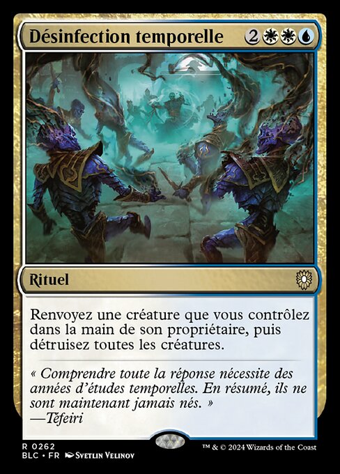![]() Variations— Parts— | Désinfection temporelleRenvoyez une créature que vous contrôlez dans la main de son propriétaire, puis détruisez toutes les créatures.