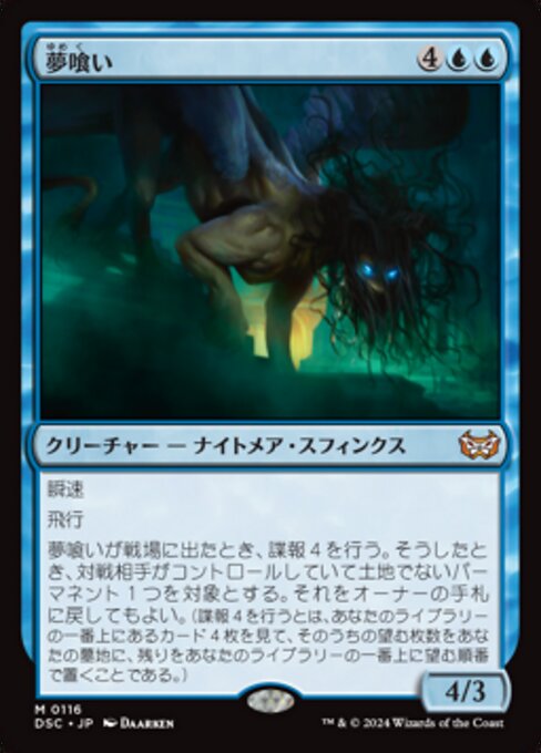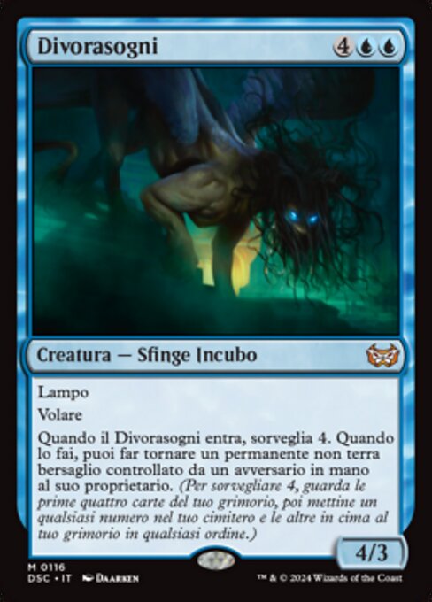 ![]() Variations— Parts— | Divorasogni4 / 3 Lampo Volare Quando il Divorasogni entra, sorveglia 4. Quando lo fai, puoi far tornare un permanente non terra bersaglio controllato da un avversario in mano al suo proprietario. (Per sorvegliare 4, guarda le prime quattro carte del tuo grimorio, poi mettine un qualsiasi numero nel tuo cimitero e le altre in cima al tuo grimorio in qualsiasi ordine.)