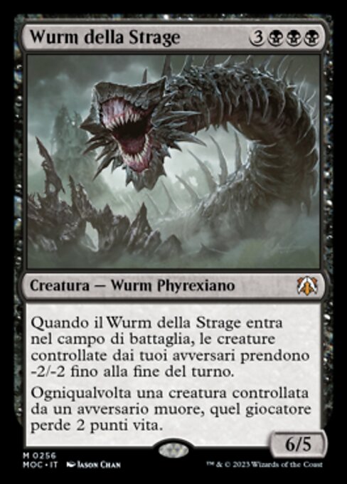 ![]() Variations— Parts— | Wurm della Strage6 / 5 Quando il Wurm della Strage entra, le creature controllate dai tuoi avversari prendono -2/-2 fino alla fine del turno. Ogniqualvolta una creatura controllata da un avversario muore, quel giocatore perde 2 punti vita.