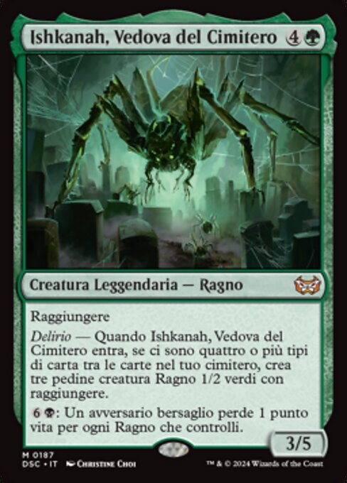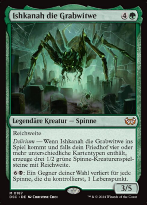 ![]() Variations— Parts— | 墓後家蜘蛛、イシュカナ3 / 5 到達 昂揚 ― 墓後家蜘蛛、イシュカナが戦場に出たとき、あなたの墓地にあるカードの中に4種類以上のカード・タイプがある場合、到達を持つ緑の1/2の蜘蛛・クリーチャー・トークン3体を生成する。