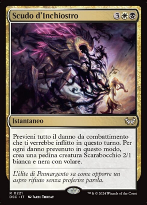 ![]() Variations— Parts— | 墨盾このターン、あなたが受けるすべての戦闘ダメージを軽減する。これにより軽減されたダメージの点数に等しい数の、飛行を持つ白黒の2/1の墨獣・クリーチャー・トークンを生成する。