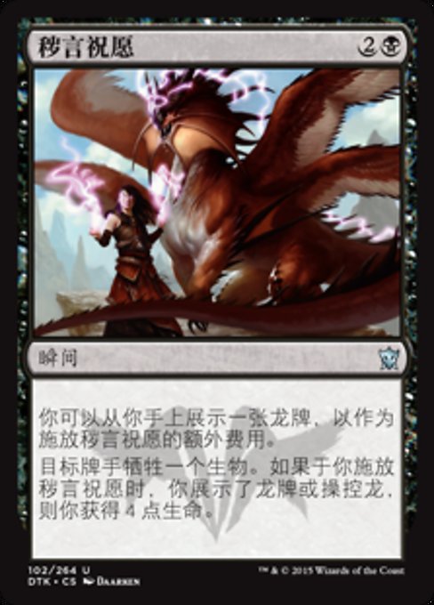 ![]() Variations— Parts— | Foul-Tongue InvocationAs an additional cost to cast this spell, you may reveal a Dragon card from your hand. Target player sacrifices a creature of their choice. If you revealed a Dragon card or controlled a Dragon as you cast this spell, you gain 4 life.