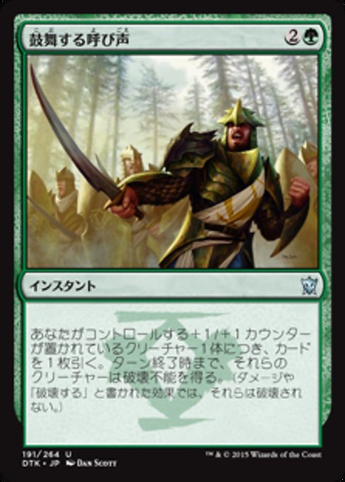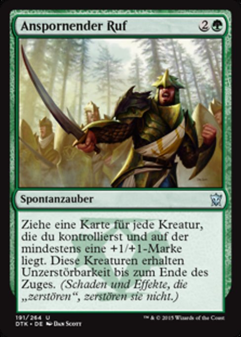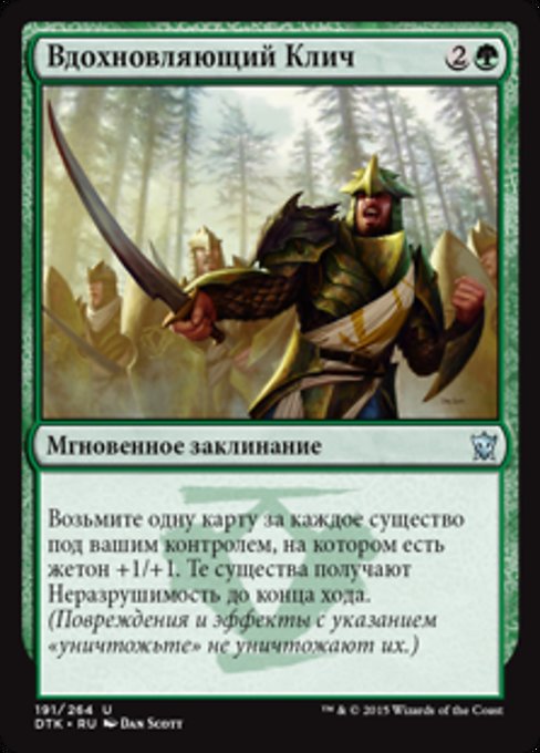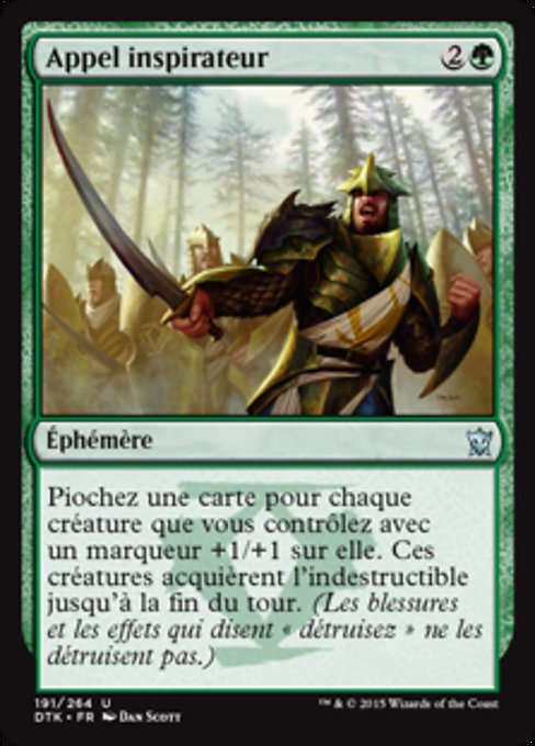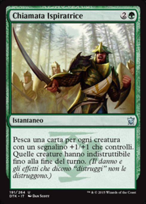 ![]() Variations— Parts— | Inspiring CallDraw a card for each creature you control with a +1/+1 counter on it. Those creatures gain indestructible until end of turn. (Damage and effects that say "destroy" don't destroy them.)
