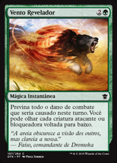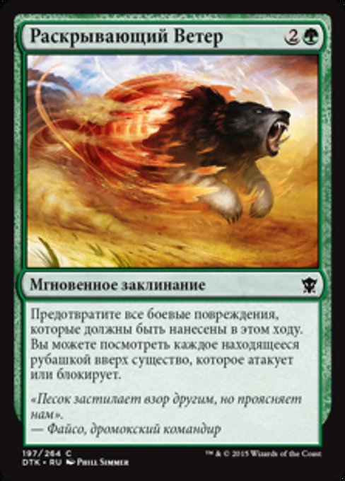 |  Variations— Parts— | Revealing WindPrevent all combat damage that would be dealt this turn. You may look at each face-down creature that's attacking or blocking.