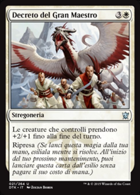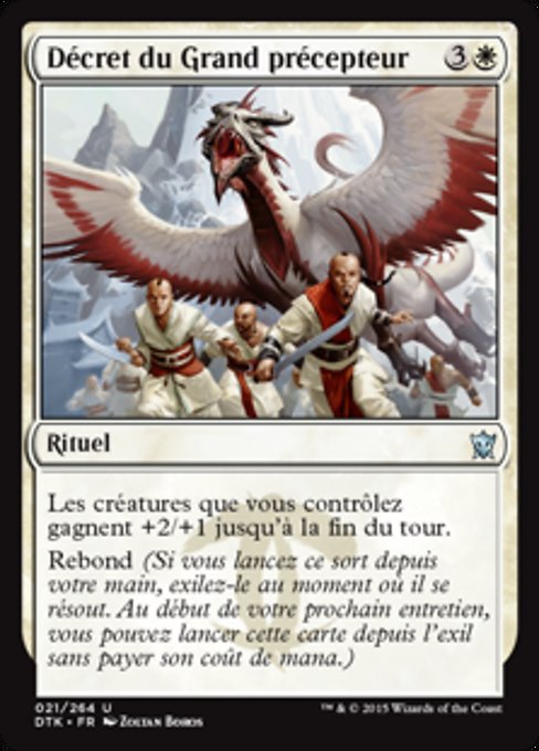 |  Variations— Parts— | Great Teacher's DecreeCreatures you control get +2/+1 until end of turn. Rebound (If you cast this spell from your hand, exile it as it resolves. At the beginning of your next upkeep, you may cast this card from exile without paying its mana cost.)