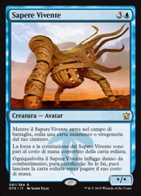![]() Variations— Parts— | Living Lore* / * As this creature enters, exile an instant or sorcery card from your graveyard. Living Lore's power and toughness are each equal to the exiled card's mana value. Whenever this creature deals combat damage, you may sacrifice it. If you do, you may cast the exiled card without paying its mana cost.