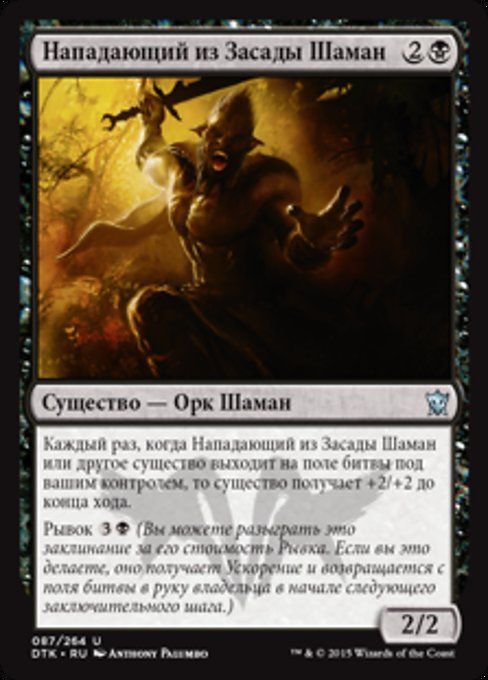 |  Variations— Parts— | Ambuscade Shaman2 / 2 Whenever this creature or another creature you control enters, that creature gets +2/+2 until end of turn. Dash