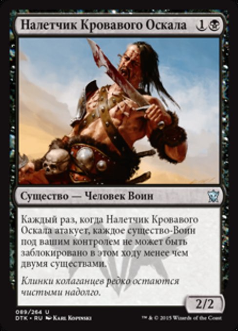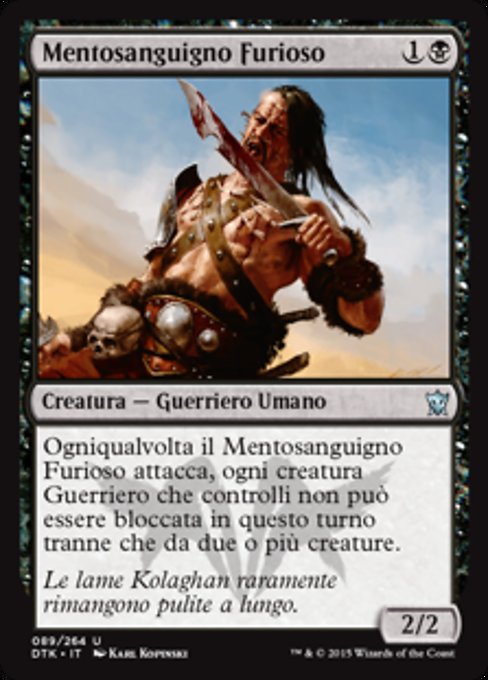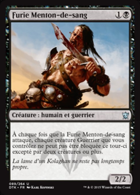 |  Variations— Parts— | Blood-Chin Rager2 / 2 Whenever this creature attacks, Warrior creatures you control gain menace until end of turn. (They can't be blocked except by two or more creatures.)