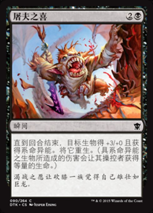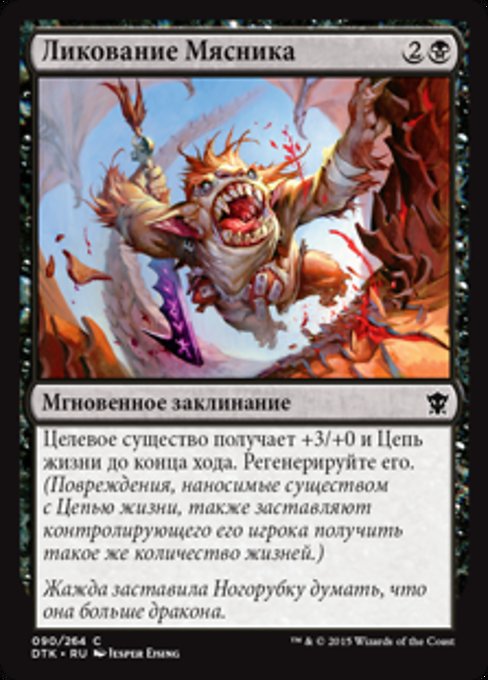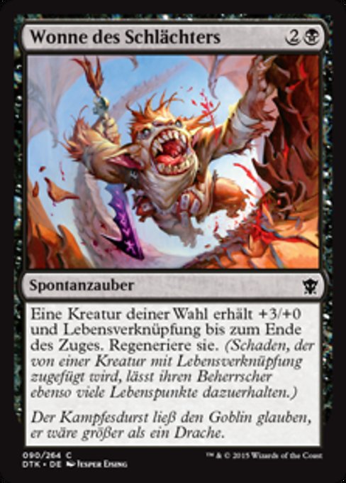 ![]() Variations— Parts— | Butcher's GleeTarget creature gets +3/+0 and gains lifelink until end of turn. Regenerate it. (Damage dealt by a creature with lifelink also causes its controller to gain that much life.)