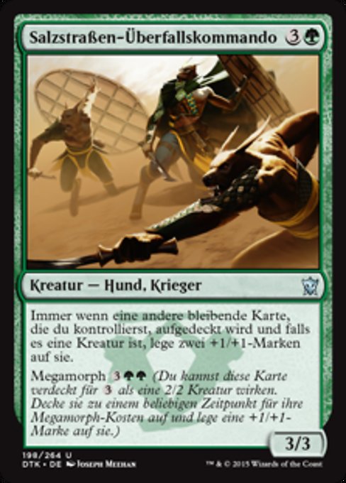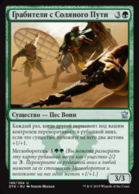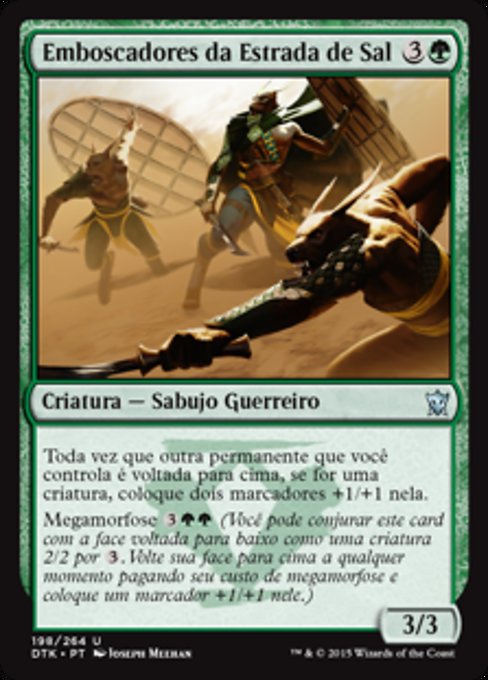 |  Variations— Parts— | Embusqueurs de la Route du sel3 / 3 À chaque fois qu'un autre permanent que vous contrôlez est retourné face visible, si c'est une créature, mettez deux marqueurs +1/+1 sur elle. Mégamue