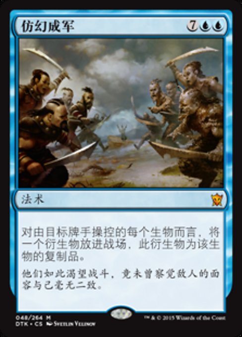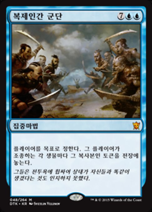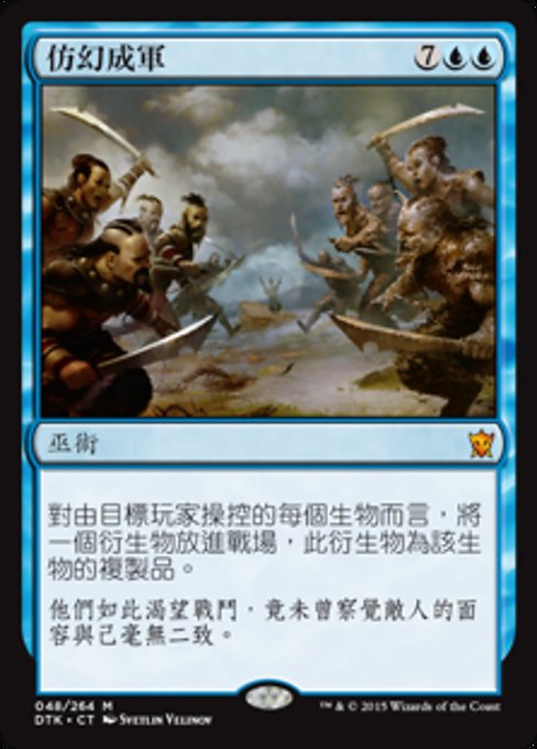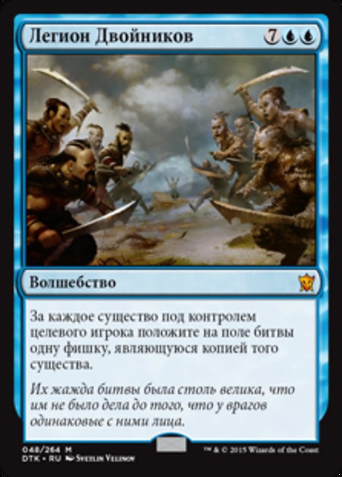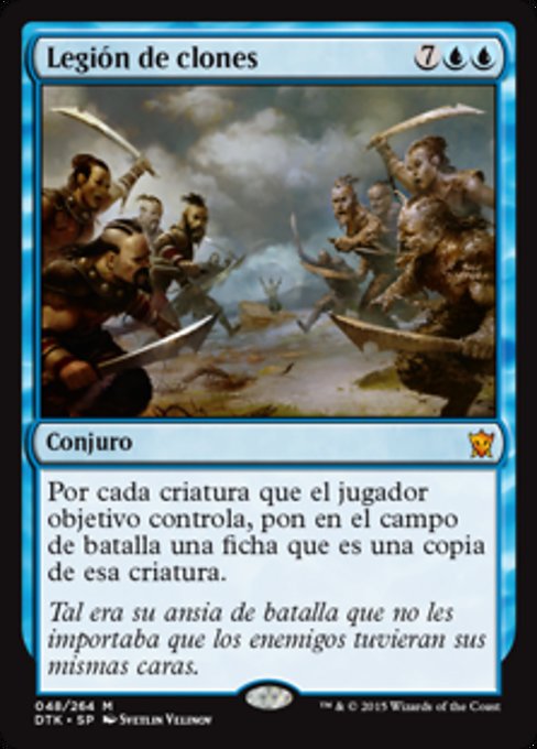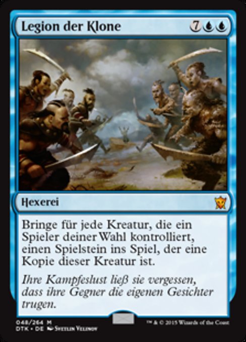 |  Variations— Parts— | Legione di CloniPer ogni creatura controllata da un giocatore bersaglio, metti sul campo di battaglia una pedina che è una copia di quella creatura.