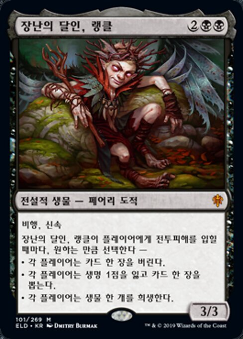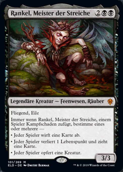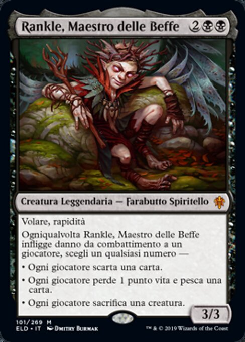 |  Variations : 1Parts— | Rankle, Master of Pranks3 / 3 Flying, haste Whenever Rankle deals combat damage to a player, choose any number — • Each player discards a card. • Each player loses 1 life and draws a card. • Each player sacrifices a creature of their choice.