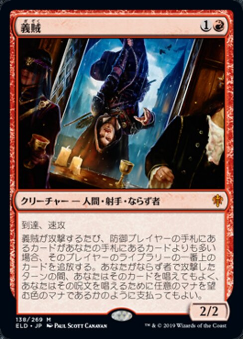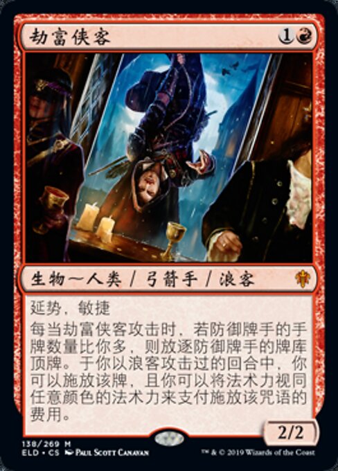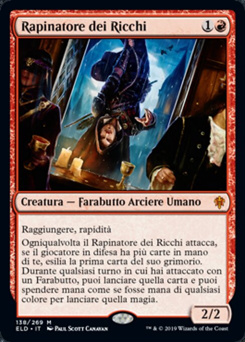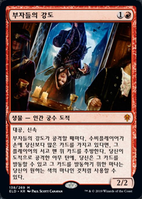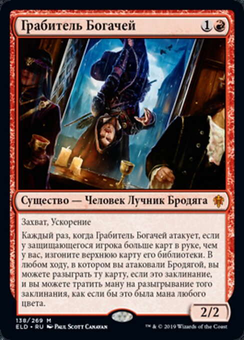 ![]() Variations : 1Parts— | Robber of the Rich2 / 2 Reach, haste Whenever this creature attacks, if defending player has more cards in hand than you, exile the top card of their library. During any turn you attacked with a Rogue, you may cast that card and you may spend mana as though it were mana of any color to cast that spell.