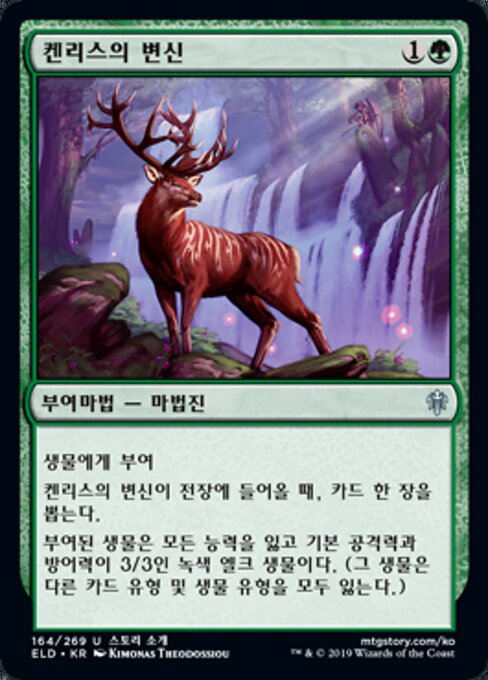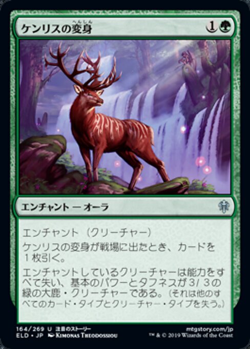 |  Variations : 1Parts— | Kenrith's TransformationEnchant creature When this Aura enters, draw a card. Enchanted creature loses all abilities and is a green Elk creature with base power and toughness 3/3. (It loses all other card types and creature types.)
