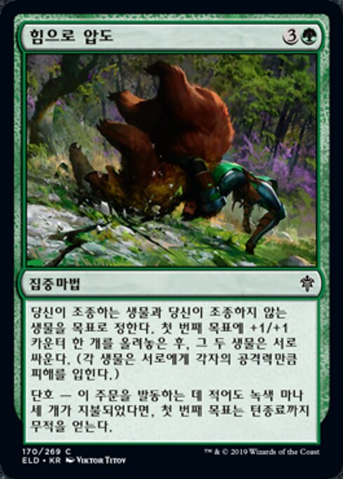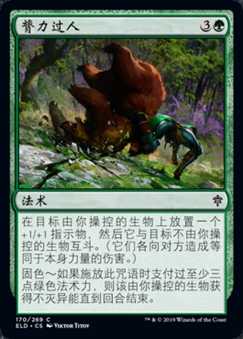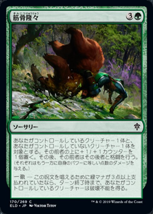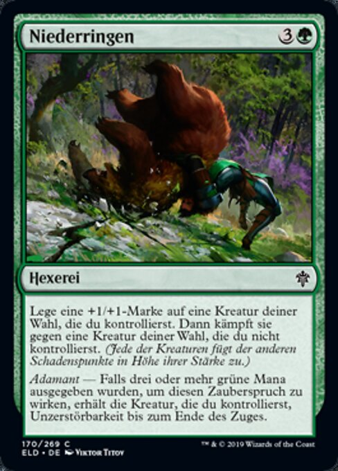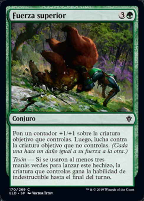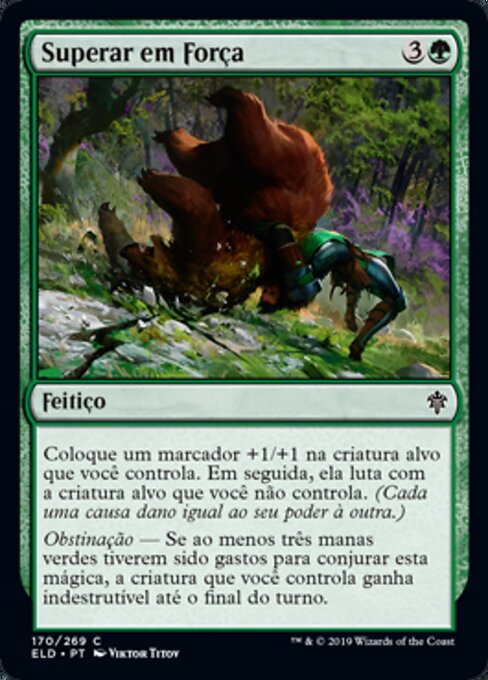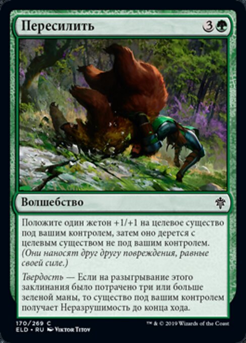 ![]() Variations— Parts— | OutmusclePut a +1/+1 counter on target creature you control, then it fights target creature you don't control. (Each deals damage equal to its power to the other.) Adamant — If at least three green mana was spent to cast this spell, the creature you control gains indestructible until end of turn.