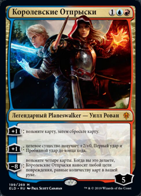 ![]() Variations : 1Parts— | The Royal Scions+1 : Draw a card, then discard a card. +1 : Target creature gets +2/+0 and gains first strike and trample until end of turn. −8 : Draw four cards. When you do, The Royal Scions deals damage to any target equal to the number of cards in your hand.
