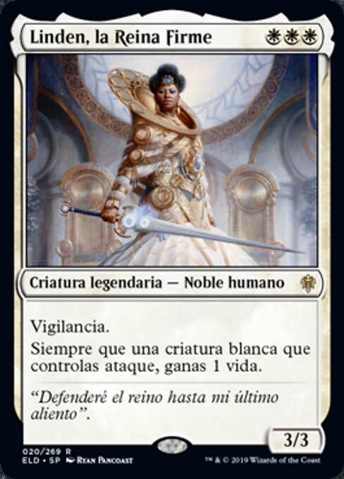 |  Variations : 1Parts— | Linden, the Steadfast Queen3 / 3 Vigilance (Attacking doesn't cause this creature to tap.) Whenever a white creature you control attacks, you gain 1 life.