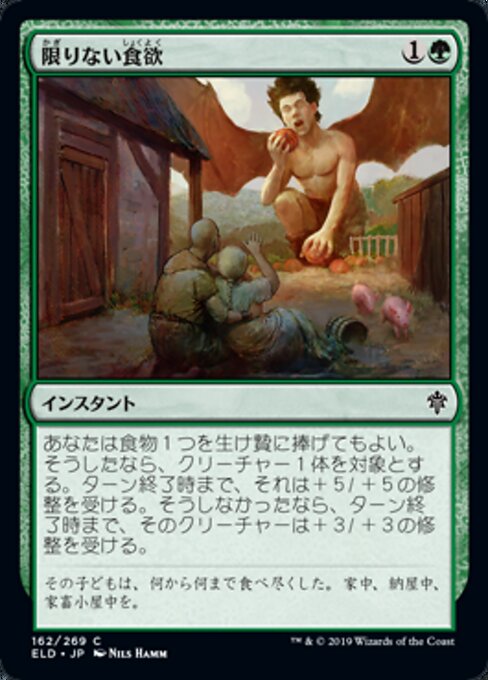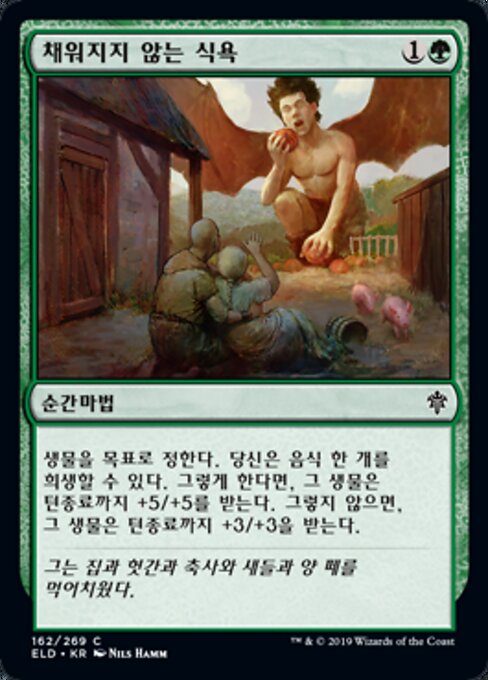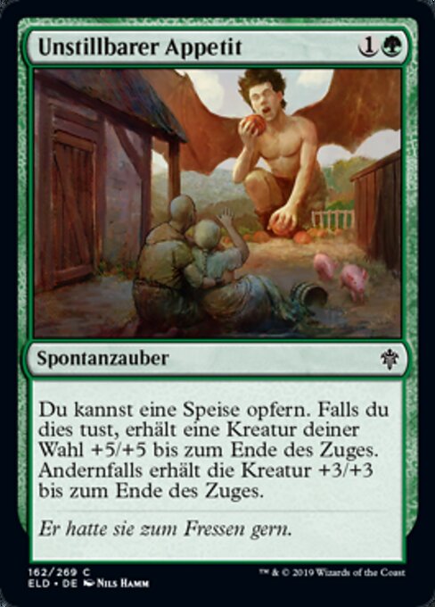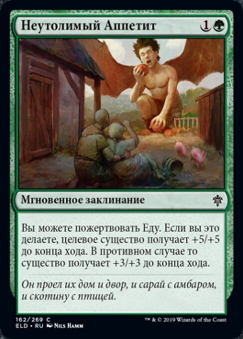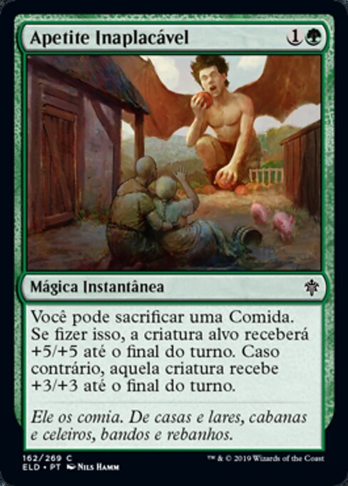 |  Variations— Parts— | Appetito InsaziabilePuoi sacrificare un Cibo. Se lo fai, una creatura bersaglio prende +5/+5 fino alla fine del turno. Altrimenti, quella creatura prende +3/+3 fino alla fine del turno.