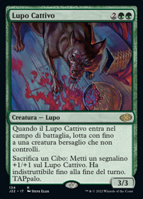|  Variations— Parts— | Lupo Cattivo3 / 3 Quando il Lupo Cattivo entra nel campo di battaglia, lotta con fino a una creatura bersaglio che non controlli. Sacrifica un Cibo: Metti un segnalino +1/+1 sul Lupo Cattivo. Ha indistruttibile fino alla fine del turno. TAPpalo.