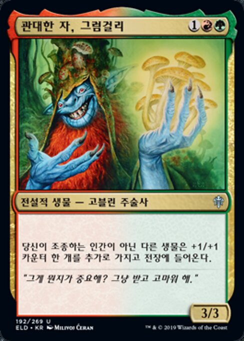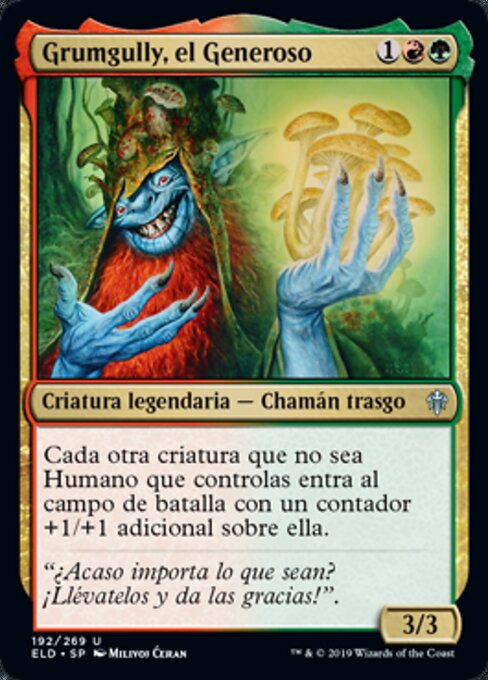 ![]() Variations— Parts— | Grumgully, il Generoso3 / 3 Ogni altra creatura non Umano che controlli entra nel campo di battaglia con un segnalino +1/+1 addizionale.