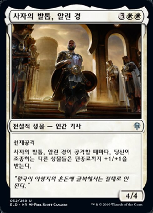 |  Variations— Parts— | Syr Alin, l'Artiglio del Leone4 / 4 Attacco improvviso Ogniqualvolta Syr Alin, l'Artiglio del Leone attacca, le altre creature che controlli prendono +1/+1 fino alla fine del turno.