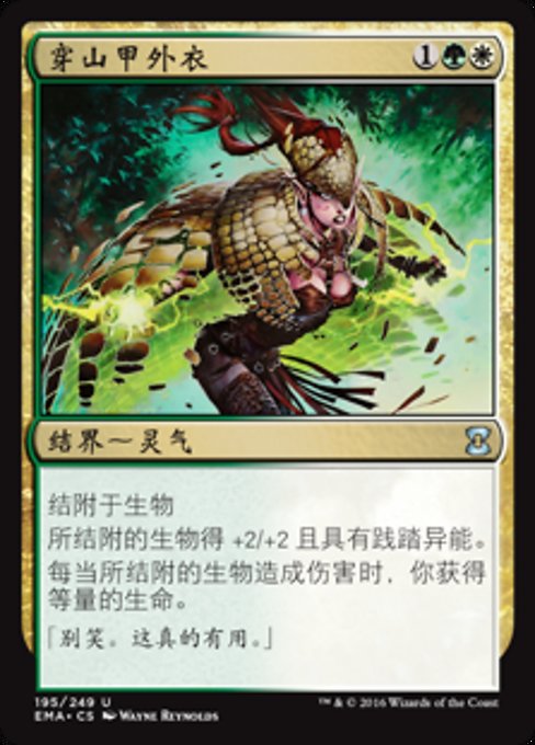 ![]() Variations— Parts— | Armadillo CloakEnchant creature Enchanted creature gets +2/+2 and has trample. Whenever enchanted creature deals damage, you gain that much life.