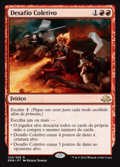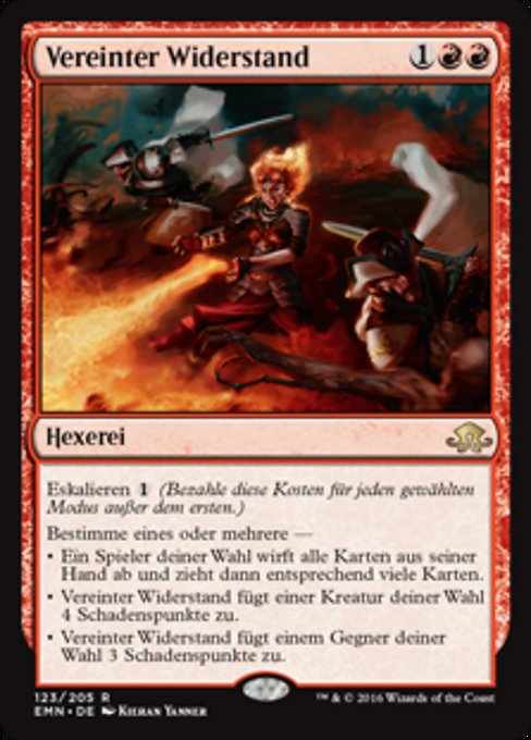 ![]() Variations— Parts— | Collective DefianceEscalate Choose one or more — • Target player discards all the cards in their hand, then draws that many cards. • Collective Defiance deals 4 damage to target creature. • Collective Defiance deals 3 damage to target opponent or planeswalker.