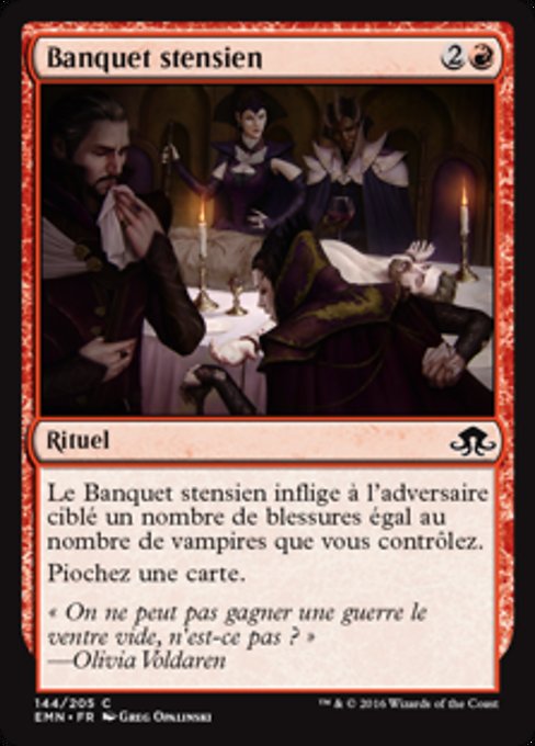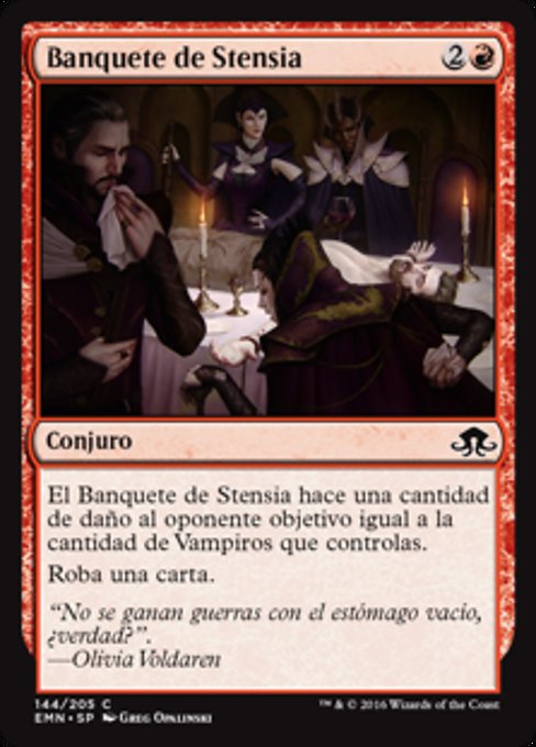 LegalitiesLegal Duel Legacy Modern Pauper Pioneer Vintage Commander Oathbreaker Paupercommander Not Legal Brawl Penny Predh Future Alchemy Historic Standard Timeless Gladiator Oldschool Premodern Standardbrawl RulingsYou may cast Stensia Banquet targeting an opponent even if you control no Vampires. You’ll still draw a card.