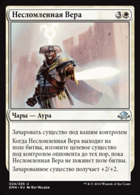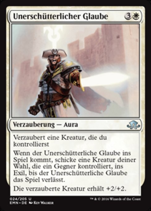 ![]() Variations— Parts— | Faith UnbrokenEnchant creature you control When this Aura enters, exile target creature an opponent controls until this Aura leaves the battlefield. Enchanted creature gets +2/+2.