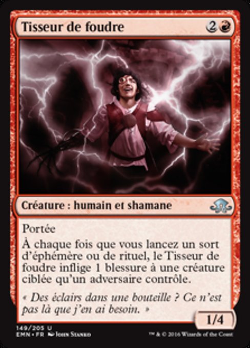 ![]() Variations— Parts— | Tessitore di Fulmini1 / 4 Raggiungere Ogniqualvolta lanci una magia istantaneo o stregoneria, il Tessitore di Fulmini infligge 1 danno a una creatura bersaglio controllata da un avversario.