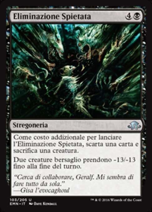 ![]() Variations— Parts— | 無情な処分無情な処分を唱えるための追加コストとして、カード1枚を捨てるとともにクリーチャー1体を生け贄に捧げる。 クリーチャー2体を対象とする。ターン終了時まで、それらはそれぞれ-13/-13の修整を受ける。