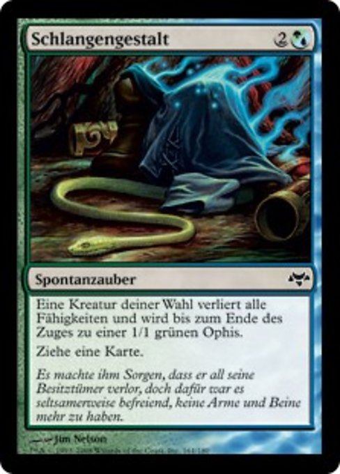 ![]() Variations— Parts— | SnakeformUntil end of turn, target creature loses all abilities and becomes a green Snake with base power and toughness 1/1. Draw a card.