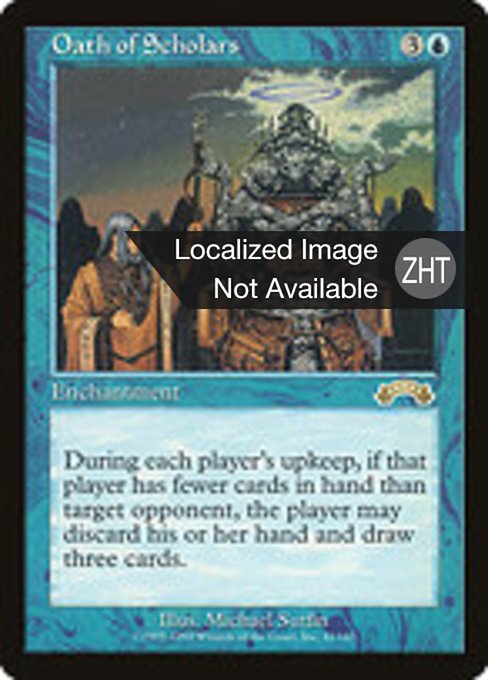 ![]() Variations— Parts— | Oath of ScholarsAt the beginning of each player's upkeep, that player chooses target player who has more cards in hand than they do and is their opponent. The first player may discard their hand and draw three cards.