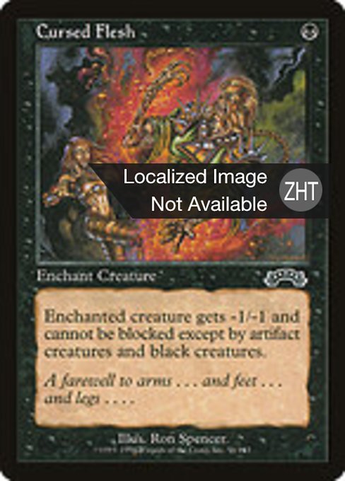 |  Variations— Parts— | Cursed FleshEnchant creature Enchanted creature gets -1/-1 and has fear. (It can't be blocked except by artifact creatures and/or black creatures.)