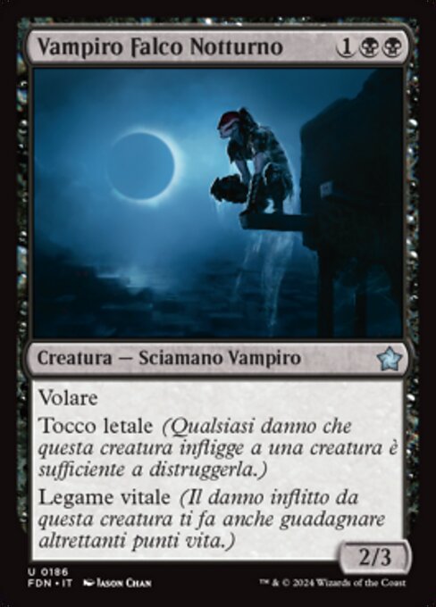 |  Variations— Parts— | Halcón nocturno vampiro2 / 3 Vuela. Toque mortal. (Cualquier cantidad de daño que esto haga a una criatura es suficiente para destruirla.) Vínculo vital. (El daño hecho por esta criatura también hace que ganes esa misma cantidad de vidas.)