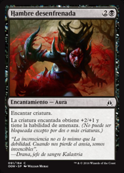 ![]() Variations— Parts— | Hambre desenfrenadaEncantar criatura. La criatura encantada obtiene +2/+1 y tiene la habilidad de amenaza. (No puede ser bloqueada excepto por dos o más criaturas.)